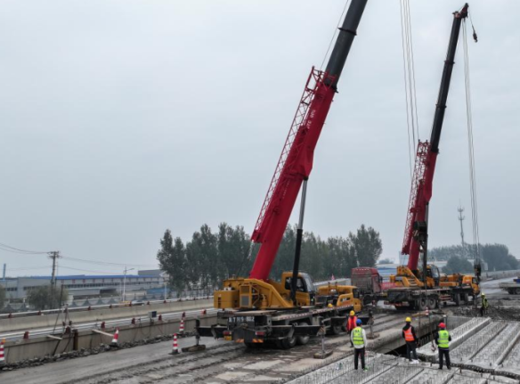 Em 15 de outubro, o projeto de ampliação da rodovia Hengde alcançou um marco crucial — a tarefa de instalação das vigas alargadas do lado direito da ponte central do Canal Guangchuan foi concluída com êxito, marcando a completa interligação do trecho alargado do lado direito e estabelecendo uma base sólida para as obras subsequentes de pavimentação.