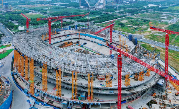 BIM + robôs de marcação, chips RFID ativos, robôs de soldagem inteligentes… uma série de “tecnologias de ponta” está sendo aplicada na construção da estrutura de aço deste projeto. Em 21 de outubro, jornalistas participaram, no projeto do Yuhang International Sports Center da Terceira Divisão da China State Construction em Zhejiang, de uma visita de intercâmbio com o tema “Inovação na integração do design de estruturas de aço de grandes arenas esportivas e construção inteligente”. “Basta importar o modelo BIM para o computador para realizar trabalhos inteligentes no local, como marcação e medição automáticas utilizando modelos 3D intuitivos, além de gerar registros relacionados de forma precisa e rápida”, explicou Han Lei, gerente do Departamento Técnico da East China Company da China State Construction Steel Structure Technology Co., Ltd., durante o evento.